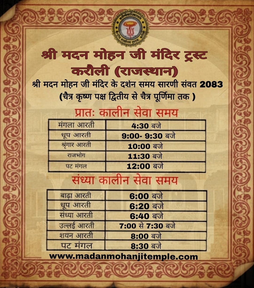 Welcome to the official website of the temple of Madan Mohan Ji in Karauli. The deity of Madan Mohan Ji (a form of Krishna) has a very special place in Vaishnav worship. The murti of Madan Mohan Ji was created by Vajranabh ji, the great-grandson of Lord Krishna, from a mystical black stone called the Brajapatthar. Madan Mohan Ji, along with Govind Dev ji, and Gopinathji, in Jaipur, form a trinity that together represents the complete form of Lord Krishna. It is said that Vajra Nabh built the statues on the direction of his grandmother, Uttara, who had saakshat darshan of Lord Krishna. To worship at the feet of Gopinath ji, the dhar or torso of Madan Mohan Ji and the face of Govind Dev ji, between a single sunrise and sunset is said to give one a complete darshan of Lord Krishna. The land of Karauliis eternally consecrated by the presence and blessings of Madan Mohan Ji Maharaj and Gopal ji and the ceaseless devotion of all Krishna bhaktas. The Madan Mohan Ji temple wishes all devotees a life of cosmic bliss and devotion in the sharan of Madan Mohan ji Maharaj.